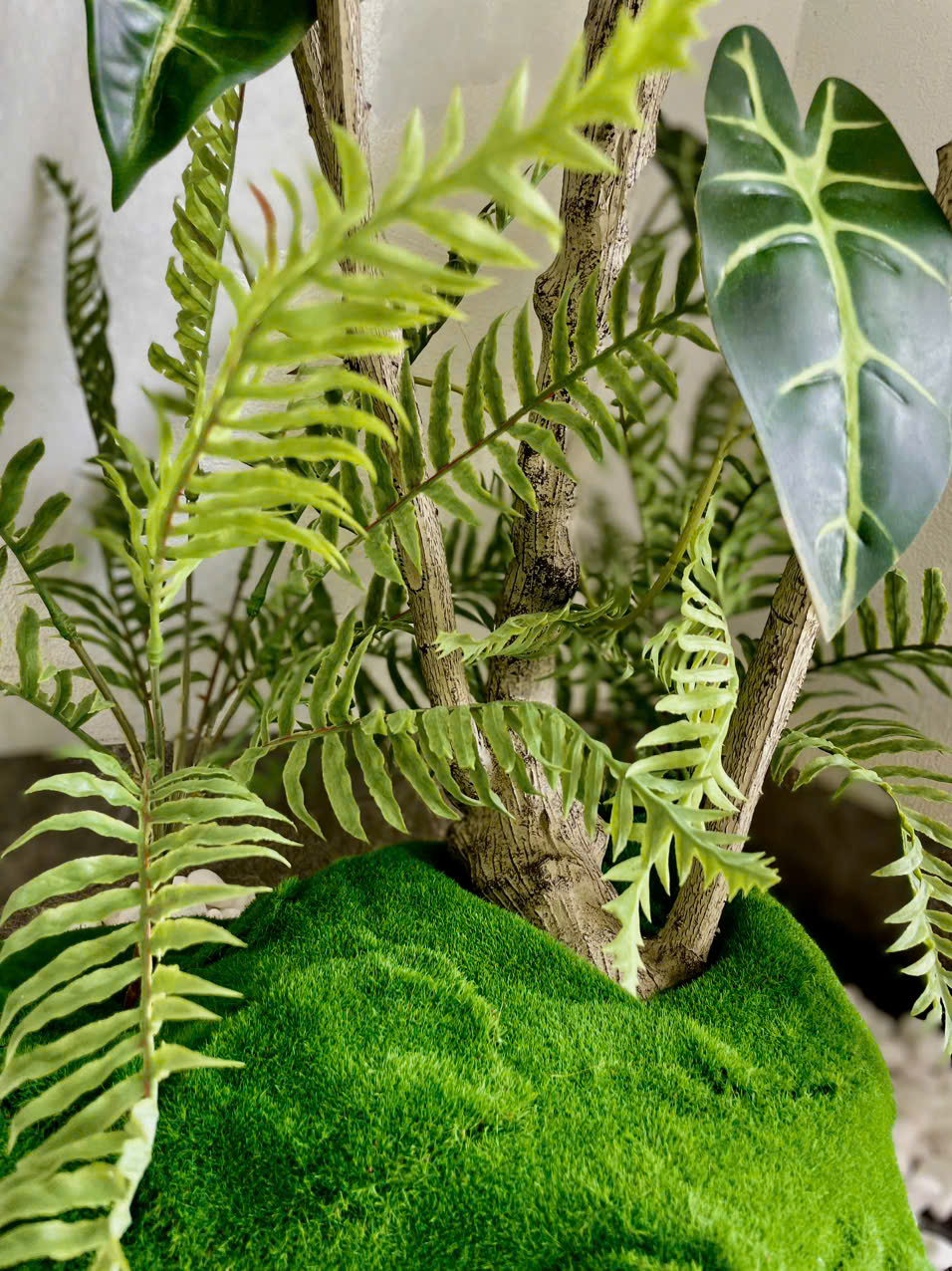 Bên dưới tán cây là lớp rêu phủ tạo nền cực kỳ sống động. Mỗi mảng rêu được xử lý tinh xảo, mô phỏng hoàn hảo lớp thảm xanh tự nhiên, tạo chiều sâu cho tổng thể tiểu cảnh và mang lại cảm giác thư giãn như giữa một khu vườn nhỏ tại gia.