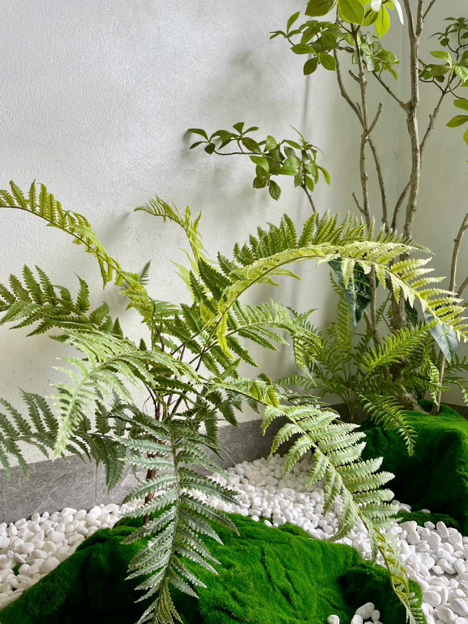 Một trong những ưu điểm vượt trội của mẫu tiểu cảnh cây giả này là khả năng tùy chỉnh bố cục một cách linh hoạt. Khách hàng có thể thay đổi vị trí các cây nhỏ, điều chỉnh chiều ngang – chiều dọc của tổng thể tiểu cảnh để phù hợp với không gian trưng bày. Thiết kế không đóng khung cứng nhắc mà hướng tới sự tự do, giúp bạn dễ dàng mix theo phong cách hình học, đường cong, khối xếp tầng hoặc lối tối giản hiện đại.