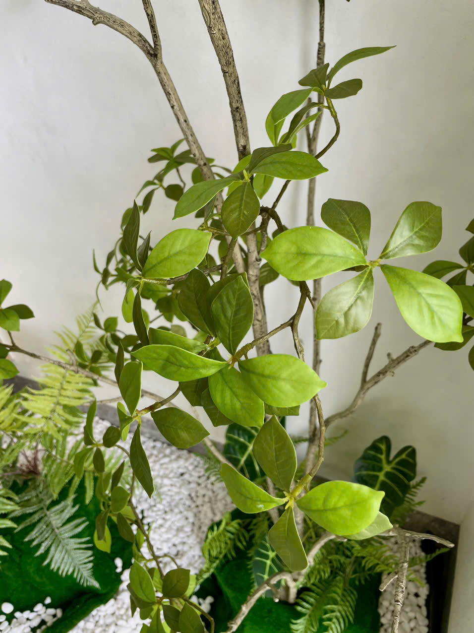 Tiểu cảnh cây giả không chỉ đơn thuần là một giải pháp trang trí nội thất, mà còn là một tác phẩm nghệ thuật mang đậm tính cá nhân hóa và thẩm mỹ đương đại. Với sự kết hợp tinh tế giữa cây Sơn Chi cao cấp và các loại cây giả nhỏ kèm theo, bộ tiểu cảnh này mang lại nét đẹp sang trọng, độc đáo cho bất kỳ không gian nào – từ biệt thự, văn phòng cao cấp, đến showroom, sảnh khách sạn hay căn hộ hiện đại.